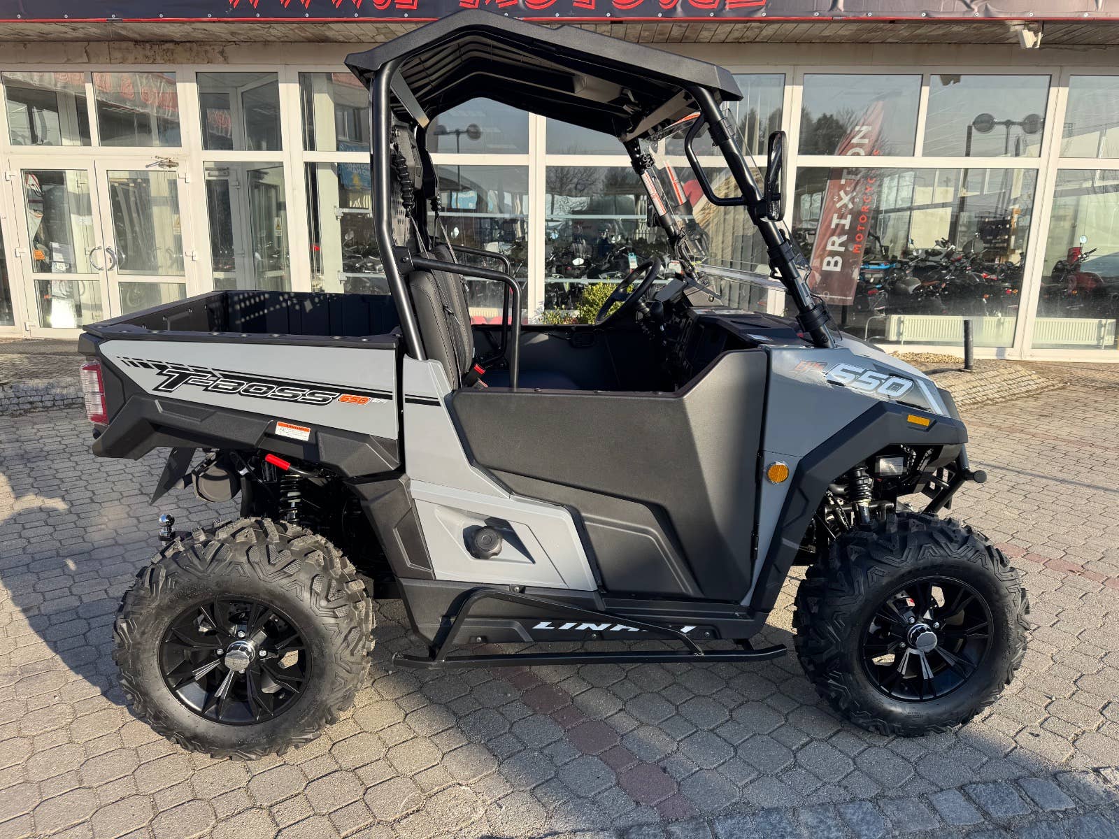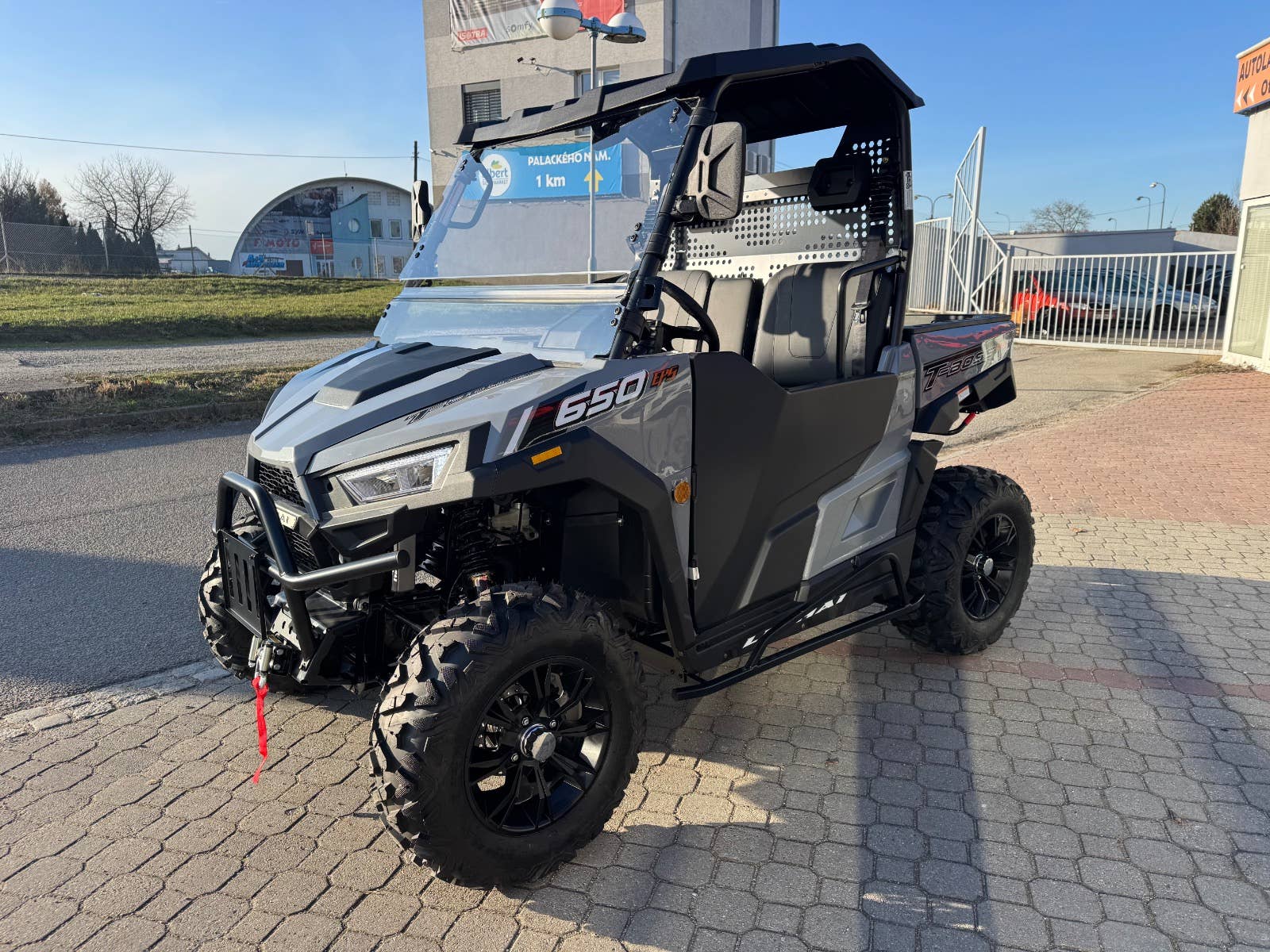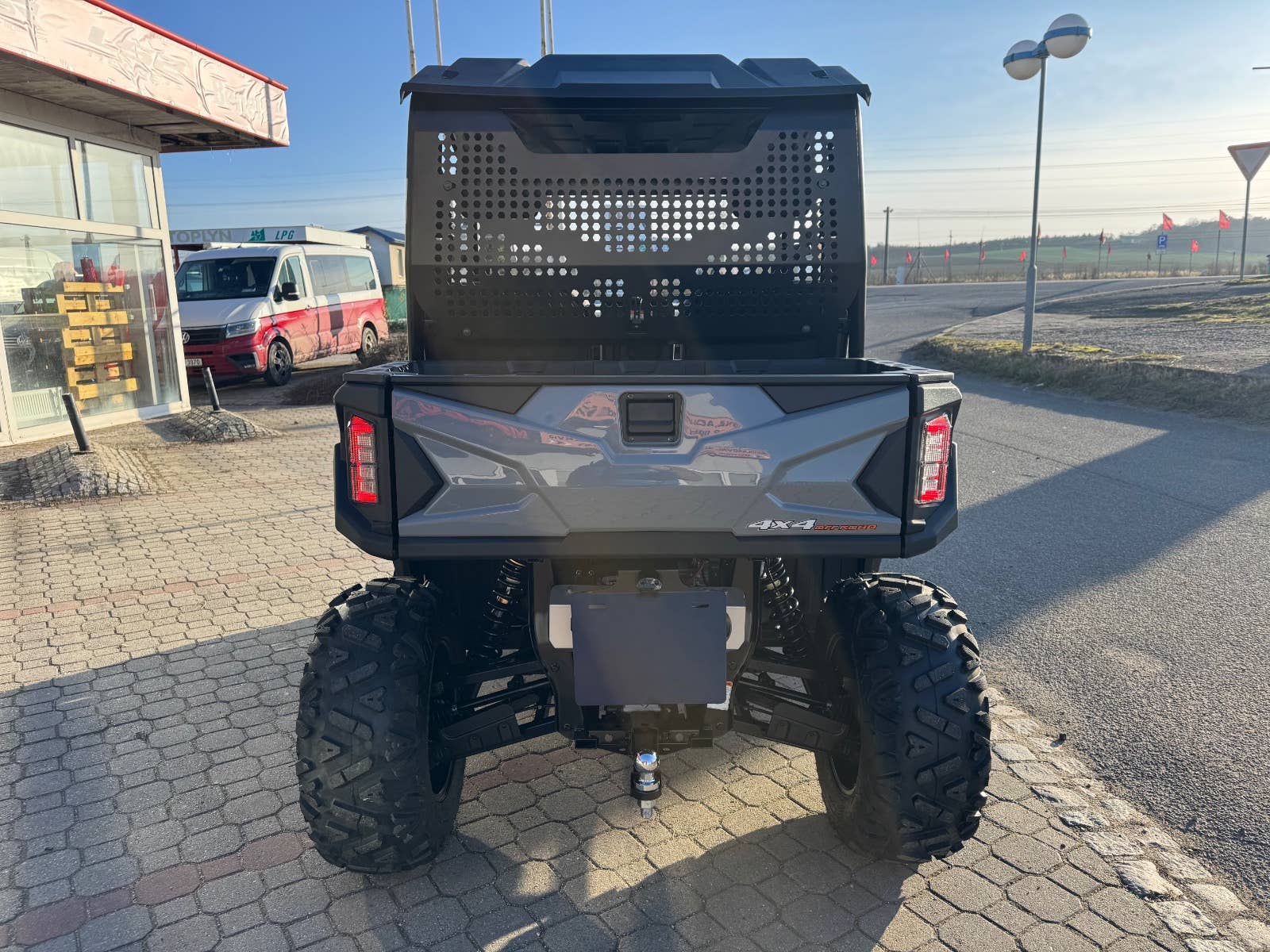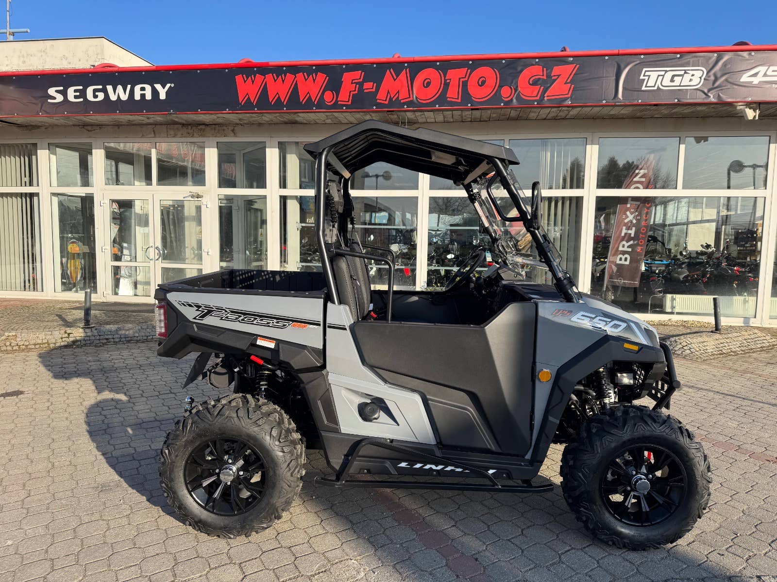Pracovní UTV E5+, kapalinou chlazený jednoválec, automatická převodovka CVTech, L/H/N/R/P, pohon 2x4 / 4x4 elektricky přepínatelný, elektrický posilovač řízení EPS, sklápěcí korba, zavěšení: nezávislá dvojitá A-ramena vpředu i vzadu, 4x hydraulická kotoučová brzda, tažné zařízení, přední ochranný rám, el. naviják 3000 lbs s dálkovým ovládáním, LED osvětlení vzadu, ALU disky