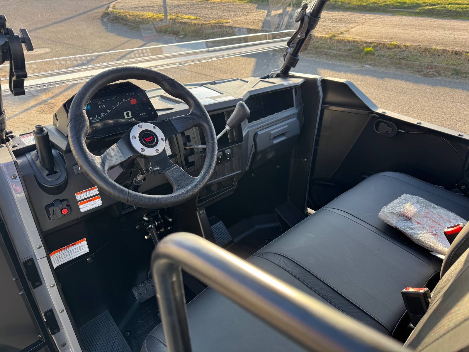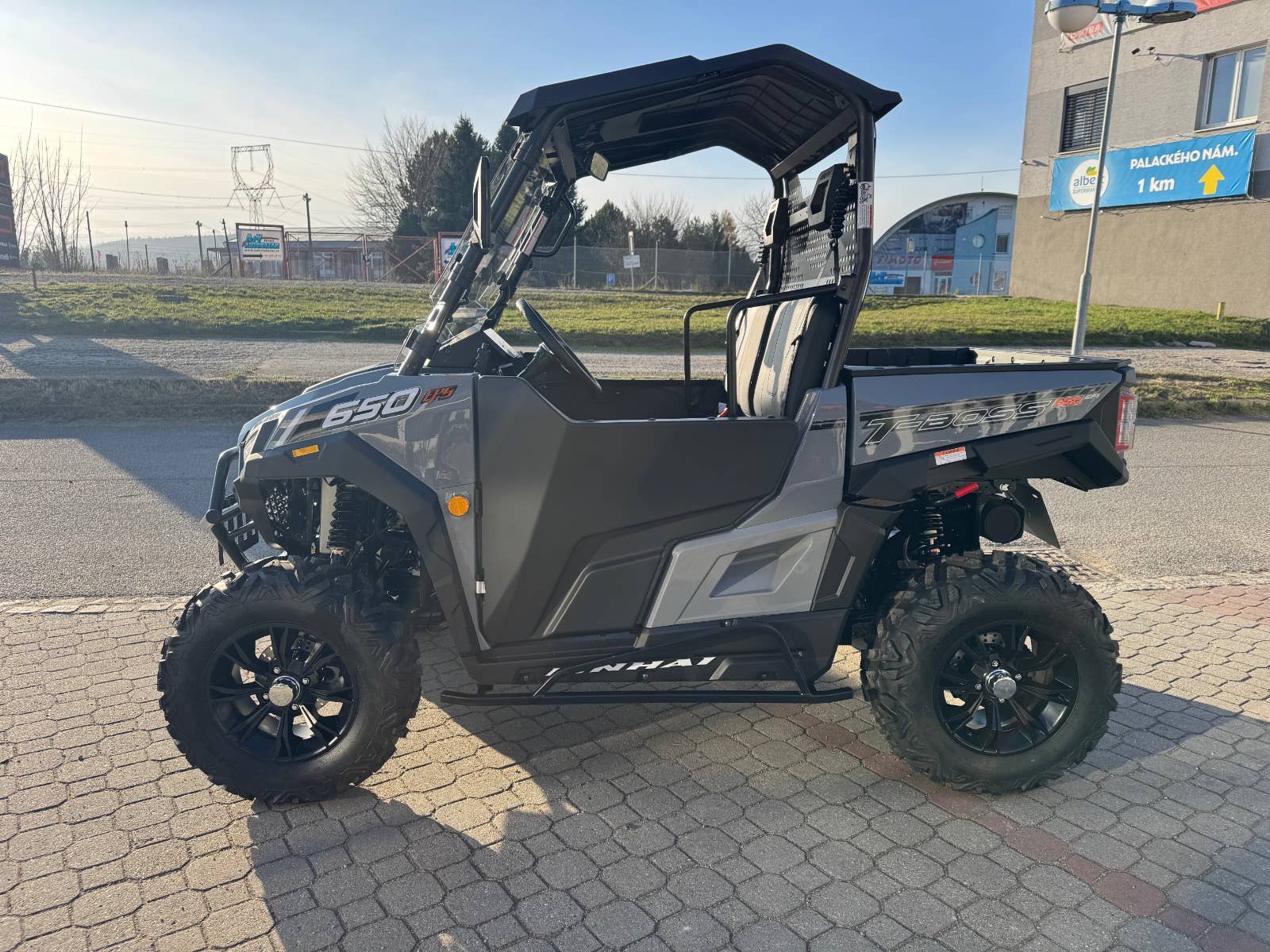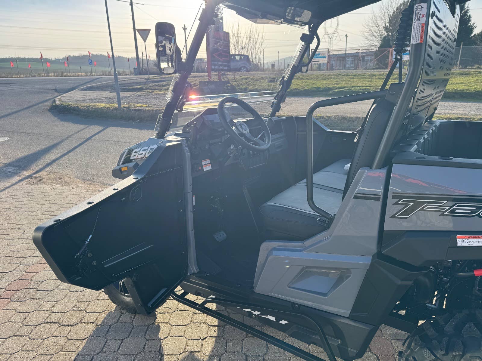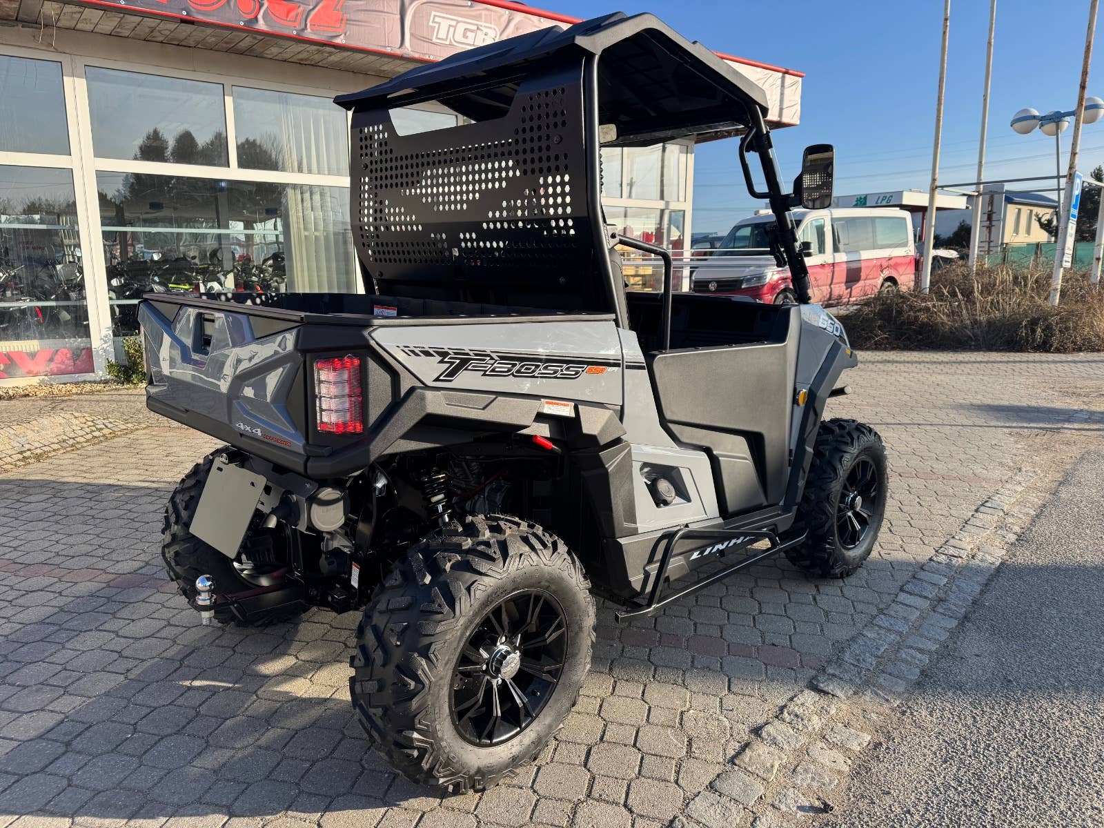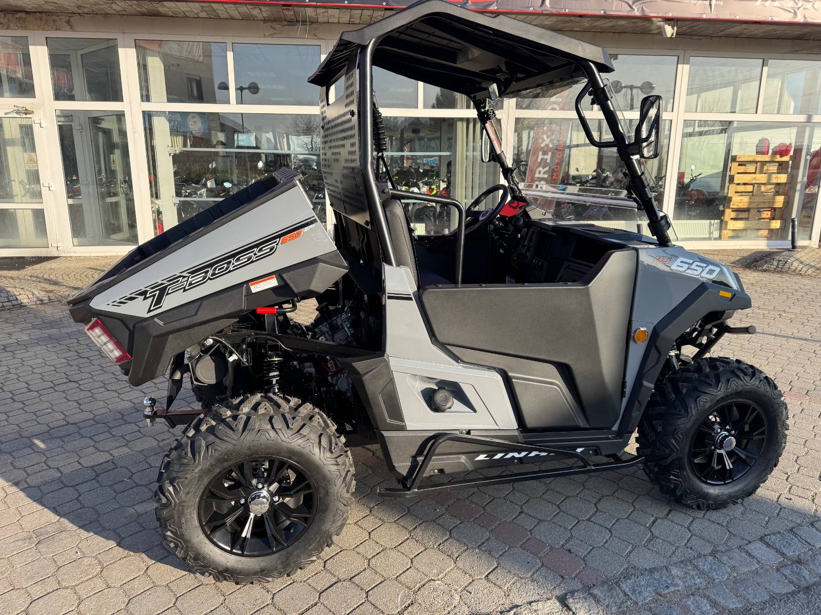 Pracovní UTV E5+, kapalinou chlazený jednoválec, automatická převodovka CVTech, L/H/N/R/P, pohon 2x4 / 4x4 elektricky přepínatelný, elektrický posilovač řízení EPS, sklápěcí korba, zavěšení: nezávislá dvojitá A-ramena vpředu i vzadu, 4x hydraulická kotoučová brzda, tažné zařízení, přední ochranný rám, el. naviják 3000 lbs s dálkovým ovládáním, LED osvětlení vzadu, ALU disky
